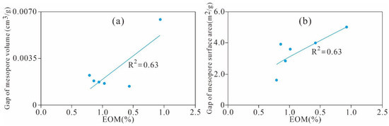 The EOM and gap value of meso-PV and SA exhibits an obvious positive correlation with coefficients of 0.63 and 0.63, respectively (Figure 26a,b). This finding implied that residual hydrocarbon have a significant effect on the formation and development of the mesopore SA and PV of Xiamaling shale. The higher the content of residual hydrocarbon, the larger the mesopore SA and PV it occupies, and the larger the SA and PV of the mesopore of the sample after extraction, which is consistent with the correlation between residual hydrocarbon and micropore structure.