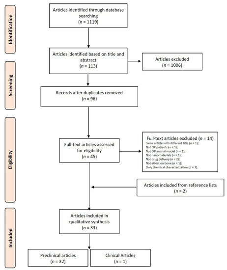 We excluded studies investigating (1) nano-based materials as drug delivery systems in pathological conditions different from OP; (2) nano-based materials as drug delivery system in pathological conditions where OP is a bone manifestation of another disease (i.e., diabetes, Gaucher disease, cancer, rheumatic diseases, etc.); (3) the synthesis and characterization of nano-based materials as drug delivery systems without an associated preclinical and/or clinical study; (4) nano-based materials in which a drug delivery system was not present. Additionally, we excluded case reports, abstracts, editorials, letters, comments to the editor, reviews, meta-analyses, book chapters, and articles not written in English.