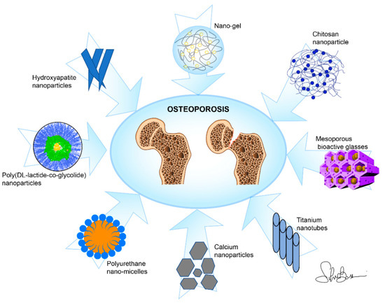 - Mora-Raimundo, P.; Manzano, M.; Vallet-Regí, M. Nanoparticles for the treatment of osteoporosis. AIMS Bioeng. 2017, 4, 259–274. [Google Scholar]