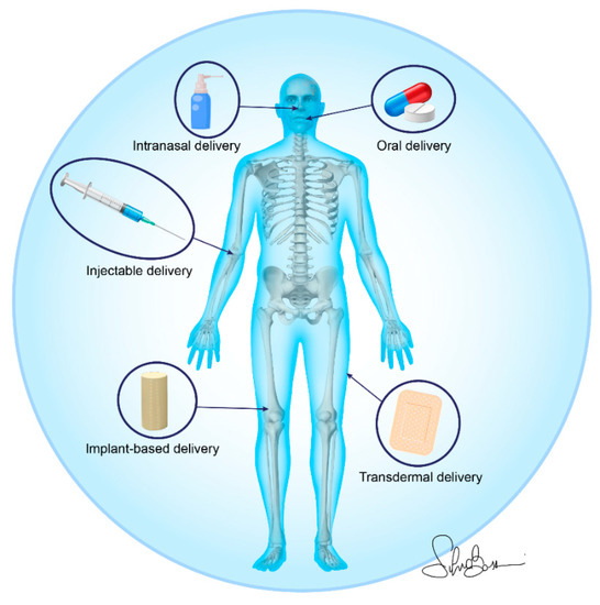 In this review, the approaches to deliver drugs for OP treatment through nano-based materials include, in the preclinical in vivo studies, injectable delivery (39%), implant-based delivery (35%), oral delivery (13%), transdermal delivery (10%), and intranasal delivery (3%) [30,31,32,33,34,35,36,37,38,39,40,41,42,43,44,45,46,47,48,49,50,51,52,53,54,55,56,57,58,59,60], while the approach used in the only clinical study found in this review was oral delivery [29] (Figure 4).