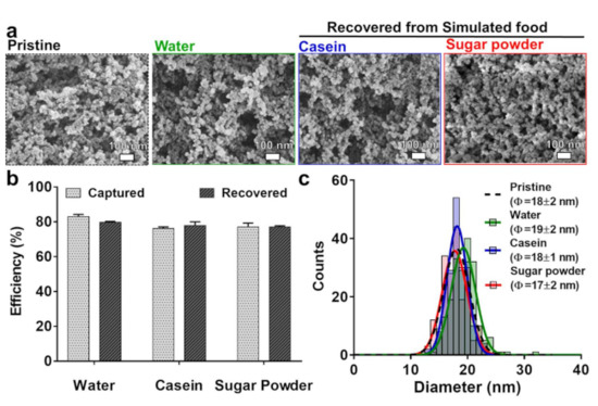 Separation of SiO2 particles from real processed food would be significantly different from the separation of SiO2 from a simple aqueous suspension since food is comprised of complicated food matrices such as carbohydrates, proteins, fats, and various salts. Thus, we investigated the capture and recovery efficiency of SBP-MBP@SMMBs for the SiO2 that is present in representative food matrices such as casein and sugar powder. As expected, the presence of casein severely affected the recovery of SiO2 particles. The casein was speculated to be interfering with the ligand-mediated separation process by coating the surface of SiO2 particles. The presence of casein induced the non-specific binding of SiO2 to the surface of SBP-MBP@SMMBs, inhibiting the maltose-mediated elution of captured SiO2 from the captured magnetic beads. Thus, the recovery efficiency of SiO2 from the sample containing casein was shown to be lower than 10% (Figure S4). The inhibitory effect of casein to the recovery of SiO2 particles was resolved by introducing a non-ionic surfactant, TX-100, to the binding reaction to a final concentration of 1% (w/v). The surfactant was shown to be effective in stripping off the casein from the surface of SiO2 particles, restoring the recovery efficiency close to the level obtained in water (Figure 4b). The hydrodynamic size distribution and surface charge of recovered SiO2 were not much different from those of the original SiO2 that was introduced to the sample containing casein, indicating that the surfactant was readily removed from the surface of SiO2 and did not affect the surface property of SiO2 during the extraction process (Figures S5 and S6). The separation of SiO2 particles with SBP-MBP@SMMBs was also not affected by the presence of sugar powder. SEM analysis also revealed that the size and morphologies of SiO2 particles recovered from casein and sugar powder were not much different from those of the original SiO2 particles (pristine SiO2), suggesting that the effect of the ligand-mediated magnetic separation process on the physical properties of SiO2 particles is negligible (Figure 4a,c). In other words, the affinity based magnetic separation was suitable to monitor the physicochemical properties of food additive SiO2 in various foods.