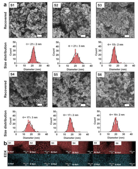 (a) SEM images and corresponding size distribution of recovered SiO2 using SBP-MBP@SMMBs from commercial processed foods. (b) EDX elemental mapping of the corresponding SEM image of (a). Elemental silica (Si) and oxygen (O) are represented by red- and cyan-dots, respectively. S1, noodle soup powder; S2, chicken stock powder; S3, Coffee creamer; S4, Coffee mix; S5, Milk tea powder; S6 Potato chip.