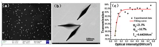 (a) Scanning electron microscope (SEM) image, (b) transmission electron microscope (TEM) image, and (c) nonlinear transmission curve.
