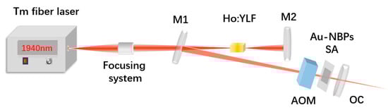 The experimental setup for characterizing the Ho:YLF DQS laser operation is shown in Figure 2. A commercial Tm:fiber laser (TDFL01-00015) with a maximum power of 30 W was used as the pump source. The central wavelength of the Tm:fiber laser was 1940 nm and the temperature was maintained at 22 °C. In order to prevent the pumped laser from returning and destroying the Tm:fiber laser, we adopted a simple V-shaped plane-concave cavity with a physical length of 196 mm. A lens with a focal length of 100 mm was used to collimate and focus the pump laser into the crystal. The block-shaped Ho:YLF crystal had a dopant concentration of 0.5 at. %, and dimensions of 3 × 3 × 10 mm3. The faces on either end were antireflection-coated at 1940 nm and 2050 nm. To increase the heat dissipation, the Ho:YLF crystal was wrapped in indium foil and tightly fastened in a water-cooled Cu billet, with the cooling water’s temperature (accuracy of 0.1 °C) kept stable at 13.0 °C. The laser resonator consisted of a flat pumping mirror (M1; 1850–1950 nm, T > 99%; 2050–2150 nm, R > 99.5%); a flat high-reflective mirror (M2) with identical parameters; and a plane-concave output coupler (OC) at 2050–2150 nm, with a 200 mm radius of curvature and partial transmissions (T) of 3%. The Au-NBP plate was located 5 mm from the OC in the resonator, functioning as the SA. An AOM of 52 mm in length was placed between the M1 and OC, acting as an active Q-switch. The AQS material was crystalline quartz, with a high transmission of under 2 μm operation. Using the famous ABCD matrix to calculate the beam radius in the cavity of the Ho:YLF laser, the corresponding cavity |A + D|/2 value was assessed to be less than 0.5, indicating that the cavity would always be stable.