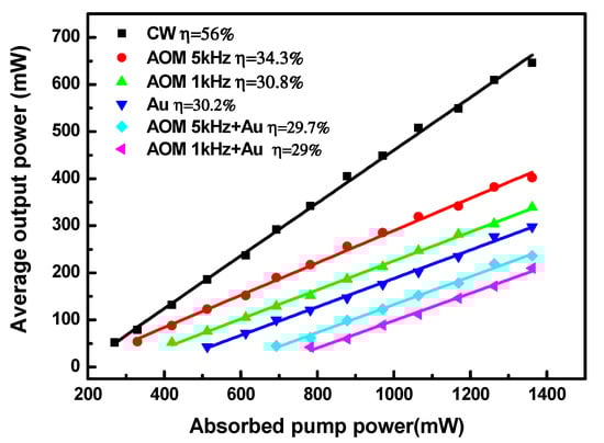 A DQS laser was constructed by inserting two modulation devices. In addition, by removing the AOM, a singly passive (PQS) laser was obtained, and by removing the Au-NBP SA, an AQS laser was obtained. Without the AOM or Au-NBP SA in the cavity, continuous wave (CW) operations could be achieved. In this experiment, we controlled the modulation rate (MR) of the AOM at 1 and 5 kHz. Figure 3 displays the average output powers as a function of the absorbed pump power. It can be seen that the output powers increased approximately linearly as the absorption pump power increased. During the whole experiment, because of the low absorption, the HO:YLF crystal was not damaged when the injection pump’s power was increased to its highest level. When the absorption pump power reached 270 mW, the CW laser was the first to commence operation. Immediately afterwards, when the absorption pump power levels were 330, 420, 215, 693, and 782 mW, the AQS (at MRs of 5 and 1 kHz), PQS, and DQS (at MRs of 5 and 1 kHz) pulsed lasers started to work, respectively. At an absorption pump power of 1.36 W, average output powers of 646, 298, 339, 402, 210, and 236 mW were achieved for the CW, PQS, AQS (at MRs of 1 and 5 kHz), and DQS (at MRs of 1 and 5 kHz) lasers, respectively. For the AQS laser, an MR of 5 kHz offered better utilization of the population inversion of the Ho:YLF crystal compared with an MR of 1 kHz; however, both exhibited a higher output power than the PQS laser.