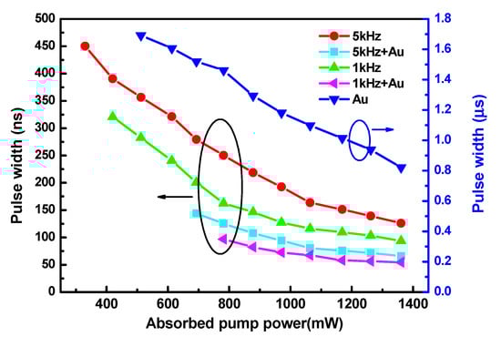 Pulse widths of Q-switched lasers versus the absorbed pump powers.