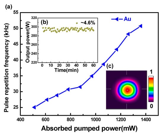 Another important characteristic of pulsed lasers is repetition frequency. For the singly PQS laser with Au-NBPs, the pulse repetition rate (PRR) gradually increased from 25.05 kHz to 50.74 kHz as the absorbed pump power increased (Figure 5a). For the AQS and DQS lasers, the PRRs were equal to the modulation rate of the AOM. Where the insertion shows the fluctuation of the maximum output power over an hour, we calculated an instability of about 4.6% (Figure 5b). The outline of the laser beam was recorded using an NS2-Pyro/9/5-PRO (Photon) instrument, as shown in Figure 5c. The figure shows that the shape of the spot is approximately circular. Different colors represent the light intensity distribution, which is symmetrical and conforms to the standard of the TEM00 mode. According to the repetition frequency and average output powers given above, the pulse peak powers were calculated, and are shown in Figure 6 and Figure 7. As can be seen in the figure, the peak powers acquired with the DQS laser were higher than those acquired with the singly Q-switched laser. At the highest absorbed pump power, the peak powers of PQS, AQS (at MRs of 1 and 5 kHz), and DQS (at MRs of 1 and 5 kHz) were 7.15, 3615, 3870, 638, and 714 W, respectively. An enhancement factor of  was also used, as defined below: