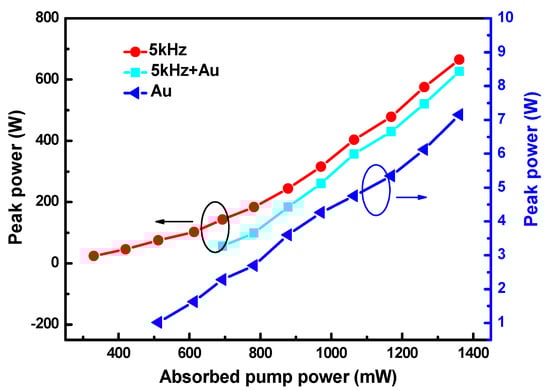 where  and  represent the pulse peak powers of the singly Q-switched and DQS lasers, respectively. For the singly AQS laser using an AOM, when the MRs were set at 1 and 5 kHz, the values of  were 1.07 and 1.12, respectively. However, for the PQS laser using Au-NBPs with an AOM of 1 and 5 kHz, the  values were 541.30 and 99.86, respectively. The results indicate that the peak powers of the DQS lasers were greatly improved.