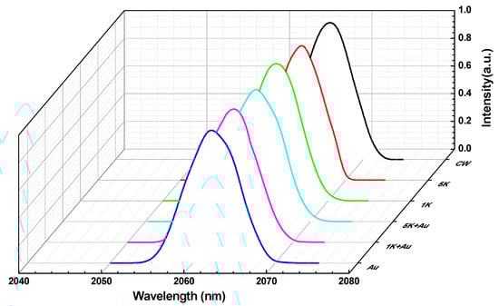The output spectra of the CW and Q-switched operations are shown in Figure 8. The central wavelength of the laser was located around 2065.86 nm in the CW mode, while it shifted to 2061.9, 2063.81, and 2064.87 nm for the singly Q-switched laser with the Au-NBPs and AOMs (at MRs of 1 and 5 kHz), respectively. Output wavelengths around 2062.89 and 2063.41 nm were observed with the DQS laser using AOMs (at MRs of 1 and 5 kHz), respectively. These spectra may result from the mutual, beneficial interactions of the laser crystal, the working wavelength of the SA, the longitudinal mode frequency condition of the cavity, and the loss condition.