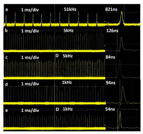 Temporal traces of pulse trains: (a) Au-NBPs PQS, (b) AQS at 5 kHz, (c) DQS at 5 kHz, (d) AQS at 1 kHz, and (e) DQS at 1 kHz.