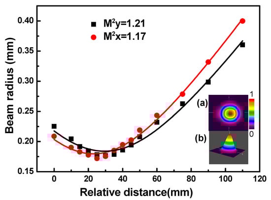 The scanning knife-edge method was used to measure the beam quality factor (M2). After passing through the focusing lens, the beam radii of the pulse lasers in the axial direction were recorded and simulated, as shown in Figure 10. The fitting values of the M2 factor in the horizontal and vertical directions were calculated to be 1.17 and 1.21, respectively, proving the existence of the near-TEM00 Gaussian mode in the V-type cavity.