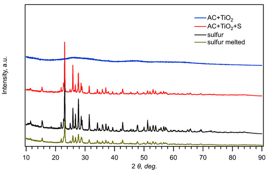 X-ray diffractograms of pure sulfur, melted sulfur, its composite with AC + TiO2, and pure AC + TiO2.