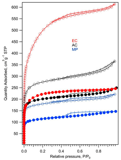 Nitrogen adsorption/desorption isotherms at 77 K of (from top to bottom) electrochemical carbon (EC, red line), commercial activated carbon (AC, black line) and mesoporous carbon (MP, blue line). The adsorption branch of the isotherm is marked with open circles, while the desorption branch is marked with crosses. Adsorption isotherms of carbon composites with TiO2 are depicted with full circles and lines of the same color as isotherms of corresponding pure carbon.
