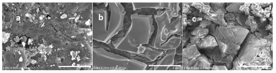 Typical scanning electron microscopy images of the AC, AC + TiO2, and AC + TiO2 + S samples are presented in Figure 3.