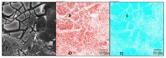The cracked TiO2 layer on the surface of AC is clearly visible in Figure 3b. Figure 3c further shows sulfur crystals covering the surface of the AC + TiO2 + S composite after the melting diffusion process (see the Experimental Section for details). Figure 4 depicts an SEM image of the sample AC + TiO2(a) and corresponding EDX concentration maps of O(b) and Ti(c) of the same focused area. The cracks and boundaries in Figure 4a are observable both in the concentration map of O and Ti in Figure 4b,c, which evidences the presence of pure TiO2 in the upper layer. The quantitative analysis of TiO2 content was carried out gravimetrically after thermal mineralization (see the Experimental Section). Specifically, our AC + TiO2 composite contained 15.6 wt% of TiO2.