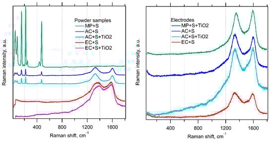 Since X-ray analysis of composites confirmed convincingly just the presence of sulfur, Raman spectroscopy was employed as a complementary technique to analyze also the host materials in our composites. This method is known to be suitable not only for the investigation of electrode materials but also for the in situ spectroelectrochemical analysis of PS [26,29,30]. Figure 5 shows the corresponding spectra of our composite materials and the final electrodes. Powder composites of carbon with sulfur (prepared as detailed in the Experimental Section) exhibit pronounced changes, which are highly specific for each parent carbonaceous material. The mesoporous carbon (MP) exhibits dominating features of sulfur in the region from 20 to 500 cm−1 but a very weak signal of carbon in the region from 1200 to 1700 cm−1 (D and G modes).