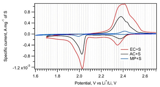 The electrochemical performance of MP, AC, and EC composites with sulfur was evaluated by cyclic voltammetry at the scan rate of 0.1 mV s−1 in a Swagelok-type cell (Figure 6). The safe potential window starts from the lower vertex potential of 1.7 V vs. Li+/Li, which is recommended as a prevention of reduction of LiNO3 electrolyte additive, severely affecting the reversibility of the sulfur cathode [1]. Yet, we show on one selected voltammogram (of MP + S) that there is still a negligible electrochemical activity even in the region of 1.6–1.7 V vs. Li+/Li. This negligible electrochemical activity allows using either of the lower vertex potentials (1.6 or 1.7) without significant influence on the integral voltammetric charge (cf. Figure 7, Figure 8 and Figure 9 below).