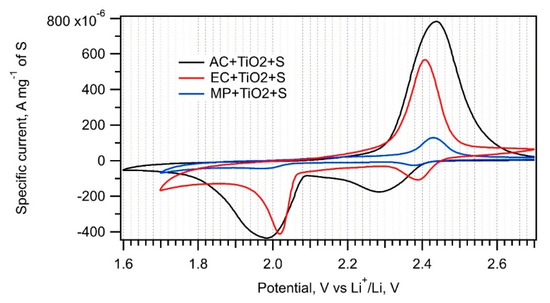 The trapping of soluble PS by nanocrystalline metal oxides added to amorphous carbon is an efficient method to improve the cell’s capacity retention [1,32]. PS are adsorbed on a metal oxide surface or inside pores. Therefore, MP, AC, and EC were impregnated with nanocrystalline TiO2 prior to their interaction with sulfur melt. Cyclic voltammograms measured on the EC + TiO2 + S, AC + TiO2 + S, and MP + TiO2 + S samples are presented in Figure 7, and the corresponding charge capacities are shown in Table 2.