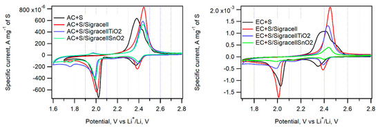 The incorporation of an additional interlayer in between the cathode and separator can efficiently hinder the diffusion of PS to the anode side of a cell. The optimum material for such a barrier layer must be electrochemically stable, porous, and able to adsorb PS. Here, we employed Sigracell carbon felt, which provides high porosity, electrochemical stability, and good elasticity. Sigracell carbon felt was used in cells with AC + S and EC + S cathodes as received, or it was covered with additional layer of TiO2 and SnO2 made by ALD. An additional thin oxide layer was expected to hinder further PS diffusion to the anode compartment due to TiO2’s ability to adsorb PS efficiently. A similar effect was observed for SnO2, too [33]. Figure 8 shows the cyclic voltammograms measured on cells with all three kinds of interlayers.