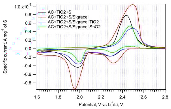 Cyclic voltammograms of the AC + TiO2 + S sample in cells without an interlayer (black curve), with the pure Sigracell interlayer (red curve) and with the modified Sigracell interlayer (TiO2—blue curve, SnO2—green curve) recorded with a scan rate of 0.1 mV s−1.