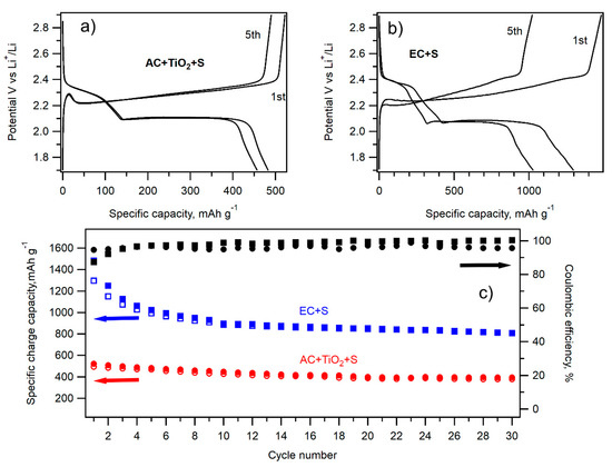Cycling performance of the most promising samples, i.e., EC + S and AC + TiO2 + S, was evaluated by galvanostatic chronopotentiometry at a 0.1 C charging/discharging rate. The charging/discharging curves of the 1st and 5th cycle are shown in Figure 10a,b. The electrochemical performance of both materials during 30 cycles of charging/discharging at the 0.1 C rate is depicted in Figure 10c. Whereas the specific charge/discharge capacity of the EC + S sample exhibits a pronounced decrease from the initial discharge capacity of 1297 mAh g−1 in the 1st cycle to 993 mAh g−1 in the 5th cycle, the discharge capacity of the AC + TiO2 + S sample is lower, but it drops by only 5% between the 1st and 5th cycle (493 and 468 mAh g−1). The impressive charge/discharge capacity of the EC + S sample is obviously an effect of the large surface area of this sample. The charge/discharge capacity of the sample AC + TiO2 + S attains values in the range of 400–500 mAh g−1. Contrary to the sample EC + S, the carbonaceous precursor AC of the AC + TiO2 + S sample is commercially available. The electrochemical performance of this sample can be further improved by the modification of its synthesis leading to the thinner layer or small isolated nanoislands of TiO2 on the surface of carbon. This is our research strategy for the near future.