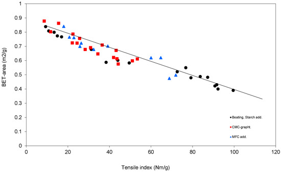 Figure 2. The relationship of the BET-area and the tensile index of nanocellulose films made from bleached paper pulp, when changing various dry strength agents (reproduced from Ref. [16] with permission from Royal Institute of Technology, Stockholm).