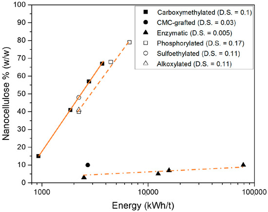 Considering the effects of charge density on the nano-yield, it is obvious that the higher the charge density, the higher the nano-yield. A similar order was found by Iwamoto et al for TEMPO-oxidized CNF materials [28]. The enzymatic CNF has an insignificant nano-yield. Hence, there is a similar order in nano-yield irrespective of the charged group in this sequence.
