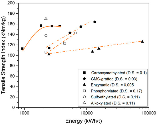Figure 4. The evolution of the tensile index vs the energy input (references in Table 2).