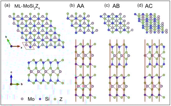 (a) Schematic structure of monolayer MoSiZ (Z = P, As) from top view and side view. The parallelogram indicates its primitive cell. (b) AA, (c) AB, (d) AC stacking patterns of bilayer MoSiZ.