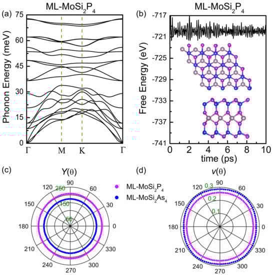 (a) Phonon dispersion curves and (b) total energy variation at 300 K of monolayer MoSiP. Inset in (b) shows the top view and side view of a snapshot at 10 ps. (c) Young’s modulus and (d) Poisson’s ratio of monolayer MoSiP (purple curve) and MoSiAs (blue curve) along arbitrary in-plane directions.