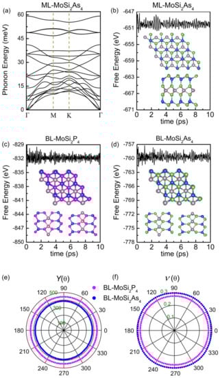 (a) Phonon band dispersion curves of the monolayer MoSiAs. Variations of total energy at 300 K as functions of time for (b) monolayer MoSiAs, (c) bilayer MoSiP, (d) bilayer MoSiAs. (e) Young’s modulus and (f) Poisson’s ratio of bilayer MoSiP (purple curve) and MoSiAs (blue curve) along arbitrary in-plane directions.