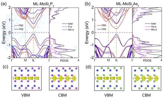 Figure 4a,b show the band structure and projected density of states (PDOS) of monolayer MoSiP and MoSiAs based on PBE and HSE06 exchange-correlation functionals. For each configuration, the band structure based on the PBE exchange-correlation functional is similar to that based on the HSE06 functional except the smaller bandgap. Both structures show a direct bandgap, and both conduction band minimum (CBM) and valence band maximum (VBM) locate at K point. This is different from monolayer MoSiN, whose CBM sits K point while VBM locates at point, presenting indirect band-gap semiconducting behavior (Ref. [18], also see Figure 5a). To get more insight into this difference, PDOS and charge distribution at VBM and CBM are plotted in Figure 5c,d. For monolayer MoSiP and MoSiAs, both CBMs and VBMs are mainly originated from the d orbitals of Mo atoms which locate in the middle layer of the structures. While, for monolayer MoSiN, VBM is dominated by both d orbital of Mo atoms and p orbital of Z atom (see Figure 5b). Due to the orbital hybridization, an obvious extension of VBM from the middle Mo atoms to beside the Z atoms occurs, which is much different from the charge distribution of VBMs in MoSiP and MoSiAs. This is reasonable because the N–Mo bonds are shorter than the P–Mo and As–Mo bonds, and thus the orbital hybridization is more likely to happen in MoSiN.