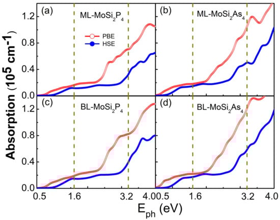 Optical absorption coefficients versus the energy of incident light for 2D (a) monolayer MoSiP, (b) monolayer MoSiAs, (c) bilayer MoSiP and (d) bilayer MoSiAs based on PBE and HSE06 functionals. For each panel, the polarization vector of incident light is set parallel to the plane, and the two vertical dashed lines indicate the region of visible light.