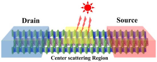 On account of the similar and excellent optical absorption performance of layered MoSiZ, we build a monolayer MoSiZ-based two-probe 2D optoelectronic device as shown in Figure 7 and evaluate its photoinduced current. To solve the quantum transport problem in this identical system, the device can be separated into three parts theoretically including a central scattering region and two semi-infinite electrodes. When the incident light energy in the scattering region is larger than the bandgap, the electrons at the valence band can be excited to the conduction band by absorbing photons. When a tiny external bias is applied between the source and the drain, the excited electrons can be driven to produce photocurrent in the system. Note that the potential difference between the left and the right leads should be much smaller than the bandgap of the system to ensure that the detected current in the electrode is completely generated by the light but not bias. The photocurrent flowing into the left probe can be expressed in terms of the NEGF as follows [49,50,51],