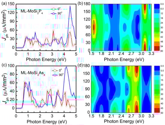 In this calculation, the incident light is perpendicular to the 2D plane, and the angle between polarization direction and transport direction is labeled as . Figure 8a,c show the photocurrent versus energy of the linearly polarized light with power density equal to and equal to and . When energy is smaller than 0.5 eV, photocurrent is equal to zero for both MoSiP and MoSiAs because the energy is smaller than their band gaps. With further increase of energy, photocurrent appears and oscillates with the energy for both and depending on the detailed behavior of band structures. Photocurrent reaches local maximum in the visible region at , and in the ultraviolet region at . To further explore the influence of incident polarization angle , photocurrent as a function of under different photon energy in the visible light region are evaluated as shown in Figure 6b,d. For both MoSiP and MoSiAs, the photocurrent is roughly symmetrical with respect to , and reaches maximums at and . Similar symmetrical distribution of photocurrent with polarization angle was also reported for monolayer KAgSe-based 2D optoelectronic device [40].