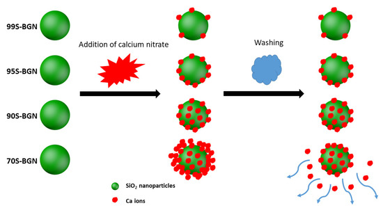 It has been well documented that a gap exists between the nominal and actual compositions of BGNs synthesized using the Stöber-based method [9,10]. In the Stöber process, Ca2+ ions are first adsorbed onto the surface of silica nanoparticles and enter the silicate network during the heating treatment [10,26]. The capacity of particle-adsorbing Ca2+ ions is the main factor determining the Ca content in the resulting BGNs, which mainly depends on the surface chemistry and SSA of silica nanoparticles [9,11,23]. It seems that in the synthesis of 99S, 95S, and 90S, the primary silica nanoparticles could adsorb almost all added Ca2+ ions, suggesting that the amount of added Ca2+ ions did not exceed their adsorbing capacity. As a comparison, although 70S exhibited a slightly higher concentration of CaO than 90S (Table 2), its actual CaO concentration (~12 mol%) was still far lower than the designed one (30 mol%). It could be deduced that this concentration (~12 mol%) of CaO could have reached the maximum amount of Ca ions that could be adsorbed by this type of nanoparticles (~110 nm of particle size, ~30 m2/g of SSA). Therefore, in the case of 70S synthesis, excess Ca2+ ions were not incorporated into the nanoparticles, leading to a composition gap in the resulting BGNs. Notably, it seems that the adsorbed Ca2+ ions were not significantly removed from the particles during washing steps in the synthesis, as indicated by the comparable concentrations of CaO between the actual and nominal compositions in 99S, 95S, and 90S. However, the washing step could still influence the final content of CaO in BGNs by removing excess adsorbed Ca2+ ions (e.g., in the case of 70S) [10]. Figure 3 shows the illustration of the synthesis process and a possible explanation to the composition differences in various BGNs. In the cases of 99S, 95S, and 90S, the silica nanoparticles possessed sufficient active sites to adsorb Ca2+ ions. The following washing step was not able to remove the adsorbed ions. Adversely, in the case of 70S, excess Ca2+ ions could not be adsorbed on the surface of the nanoparticles. Some Ca2+ ions might be loosely bonded with the outer layer of the particles, which could be easily removed by the washing step.
