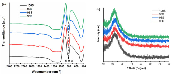 (a) Fourier transform infrared spectroscopy (FTIR) spectra and (b) X-ray diffraction (XRD) patterns of 100S, 99S, 95S, and 90S.