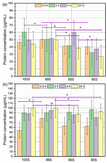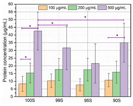 The concentrations of bovine serum albumin (BSA) adsorbed on 100S, 99S, 95S, and 90S after incubation in BSA solutions for 2 h at different BSA concentrations (100, 200, and 500 μg/mL, respectively). Three technical repeats (n = 3) were carried out within each experiment that was repeated in triplicate (N = 3). Data are presented as mean ± SD and * indicates p < 0.05.