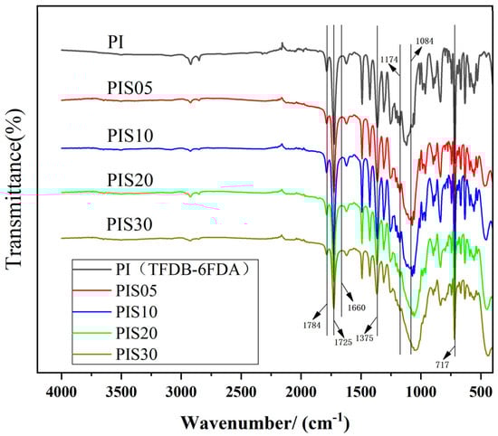 The changes in the absorption peaks of the corresponding functional groups of PI and PI/SiO2 nanocomposite films were analyzed by using an FT-IR infrared spectrometer. Some of the most commonly used wave numbers for studying the imidization process are shown in Table S2. The FT-IR spectra of the composite films with different SiO2 content are shown in Figure 1. There are four main peaks for all the composite films with different SiO2 content located at 1784 cm−1, 1725 cm−1, 1375 cm−1 and 717 cm−1, corresponding to asymmetry extensional vibration absorption peak of C=O, the symmetrical extensional vibration absorption peak of C=O, the extensional vibration absorption peak of imine ring C–N–C, and the flexural vibration absorption peak of C=O. In addition, there is no absorption peak of amide bond at 1660 cm−1 in all samples, indicating that the thermal imidization process was complete [].