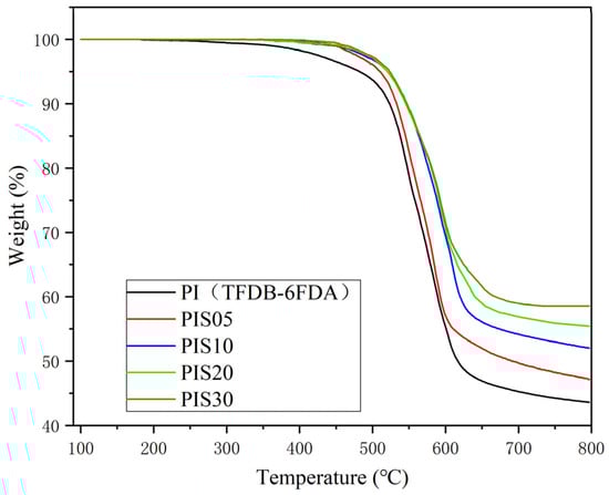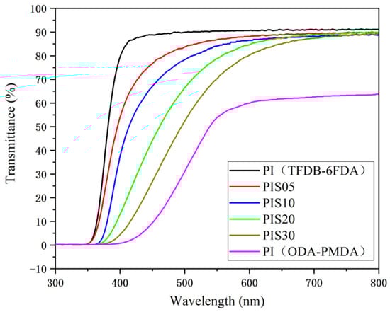 As shown in Figure 3, it can be observed that the transmittance of the TFDB-6FDA system PI film at around 400 nm has reached a high level (above 85%) and can reach 91.4% in the visible light range. However, the transmittance of traditional aromatic PI (ODA-PMDA system) film is almost 0% at about 400 nm and can only reach about 65% in the visible light range. The maximum transmittance of the PI/SiO2 composite film with various SiO2 doping displays obvious changes in the visible light region. The transmittance of the PIS05, PIS10, PIS20 and PIS30 films are 90.7%, 90%, 88.6%, 86.5%, respectively. However, the transmittances at around 500 nm are 84.7%, 79.8%, 67.4%, 55.6%, respectively, suggesting the doping of SiO2 nanoparticles affects the light transmittance of the composite film. With the gradual increase of the SiO2 content, an inorganic phase with a large size is gradually formed, which would result in the gradually decreased transmittance of the film. Moreover, the difference is small in the high wavelength region and large in the low wavelength region. This is mainly because as the content of nano-SiO2 particles increases, the probability of interaction between nanoparticles is also increasing. The particle size of some particles gradually increases due to agglomeration, and some have exceeded 100 nm, resulting in microphase separation of PI/SiO2 composite [,], thereby affecting the optical properties of composite materials.