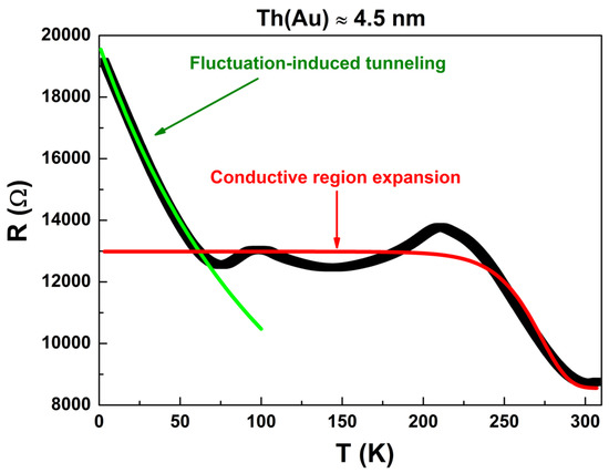 Modeling of the DC experimental data obtained for the thinnest Au film (4.5 nm). The - dependence (black dots) could be reproduced with the fluctuation-induced tunneling model below 70 K (green curve, best fit using Equation (2)) and with a phenomenological model that assumes an expansion of the conductive region from 300 to 200 K (red curve, best fit using Equation (4)).