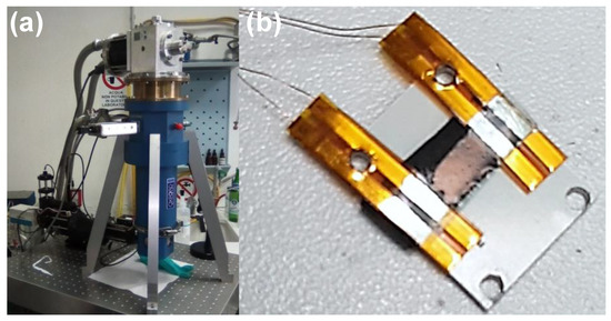 The electrical properties of the samples were characterized using a dedicated setup. The temperature control was obtained with a closed-cycle refrigerator, mod. CSW-71 compressor and RDK-408D cold-head (Sumitomo (SHI) Cryogenics of Europe GmbH, Darmstadt, Germany), capable of reaching a base temperature of 3 K and with a 1 W refrigeration power capability at 4.2 K (see Figure 4a). Similar to what was described in [50,51,52], a low-noise electronic bias and readout circuitry was used. The readout electronics were controlled using a dedicated computer equipped with high-resolution digital to analog and analog to digital interfaces through a PXI crate (National Instruments, Austin, TX, USA) and programmed using the LabVIEW environment.