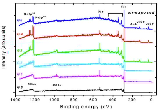 Photoelectron spectra were recorded with an AXIS-Supra photoelectron spectrometer (Kratos Analytical Ltd., Manchester, UK), using monochromatized Al Kα radiation (1486.6 eV, 300 W, area analysed—0.7 × 0.3 mm2). The samples were analysed ex-situ. Only the peaks of C, Ge, and O were observed in X-ray photoelectron spectroscopy (XPS) survey spectra, see Figure 1.