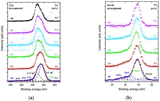 - The C sp3/C sp2 ratio is highly influenced by Ge doping, indicating the doping-induced structural evolution of carbon atoms hybridizations from sp3 to sp2 [9,34]. This is clearly seen in Figure 2a where the dominating C sp3 contribution in C 1s envelope for the undoped DLC layer G0 transforms step-by-step to the C sp2 one with increasing Ge content in the Ge-doped DLC layers G1-G5.