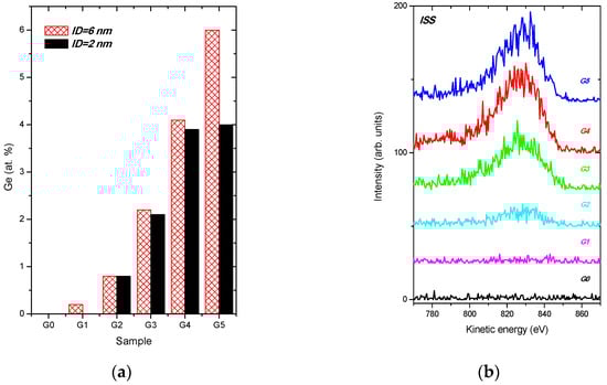 The sensitivity of LEIS for a light element as carbon is relatively poor since the ion scattering cross-sections scale with the atomic number. Moreover, a strong matrix effect occurs in low-energy He+ ion scattering from carbon, which causes He ion neutralization [40,41]. As a consequence, the spectral signal of He+ ions scattered at carbon atoms is very weak. However, the spectral signal induced by 4He ions scattered from Ge atoms can be easily recorded, see Figure 3b. A peak at about 830 eV is ascribed to ion scattering at Ge atoms [39,42]. Indeed, the spectral signal intensity from Ge atoms increased with the Ge content in a surface region of the analysed samples. Their peak areas 312, 941, 1226, and 1293 (in arbitrary units) for the G2−G5 samples, respectively, compare well with the Ge content derived from XPS spectra shown in Figure 3a and in Table 1. We underline that no spectral signal from Ge atoms is detected for the G0 sample (as expected) and for Ge-doped G1 sample. This verifies the formation of the carbon capping film at the surface of the G1 sample, as we already deduced from Figure 3a. The capping carbon film thickness t can be estimated in the range of 2 nm ≤ t < 6 nm.