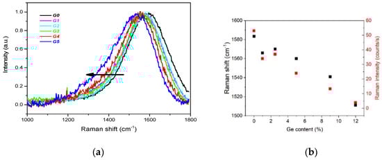 Two Raman bands are usually characteristic of DLC materials, the D-band and the G-band. For the undoped DLC layer G0 the G band is centred at 1580 cm−1, while no D band at ~ 1340 cm−1 is detected. This spectral shape is typical of high-quality DLC films [49] and is almost preserved also for the Ge-doped layers (see Figure 5). The G band is shifted to lower energies ~1510 cm−1 and, at the same time, getting wider with Ge content. The intensity of the G band significantly decreases with Ge content as well. These are the main signs of an increasing sp2 content with Ge doping [22,49], in accord with the above angular-resolved X-ray induced photoelectron spectroscopy (ARXPS) data.