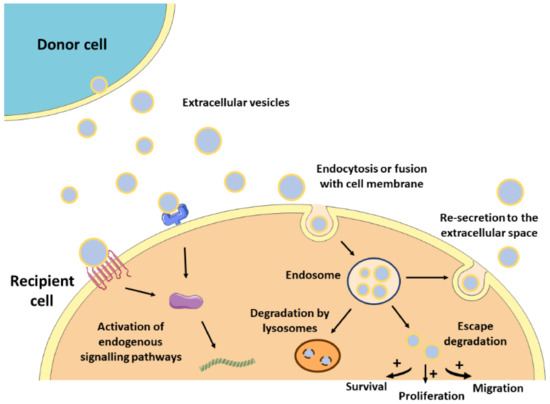 Mechanism of action of EVs. After released from donor cells, EVs may induce a response in recipient cells by different mechanisms. First, EVs may remain at the binding site on the cell membrane eliciting functional responses by activating downstream molecular pathways. Alternatively, EVs may be internalized by endocytosis or fusion with the cell membrane undergoing different intracellular fates. They can be targeted for degradation by lysosomes, they can escape degradation and modulate cell behavior, or they can be re-secreted to the extracellular space.