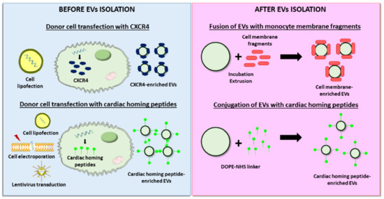 Examples of EVs surface functionalization strategies to improve cardiac targeting. Modification of EV surface can be performed before or after isolation. Regarding the first approach, donor cells are transfected/transduced to overexpress specific molecules that target cardiac epitopes on the released EV’s surface. On the other hand, different techniques can be used to incorporate cardiac-targeting molecules on the EV’s surface after isolation, such as fusion of EVs with monocyte membrane fragments by incubation/extrusion or conjugation of cardiac homing peptides via a dioleoylphosphatidylethanolamine N-hydroxysuccinimide (DOPE-NHS) linker.