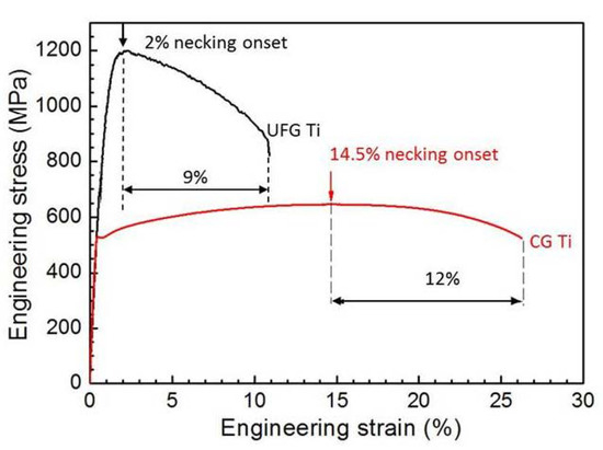 Global engineering stress-strain curves of the UFG and CG Ti.