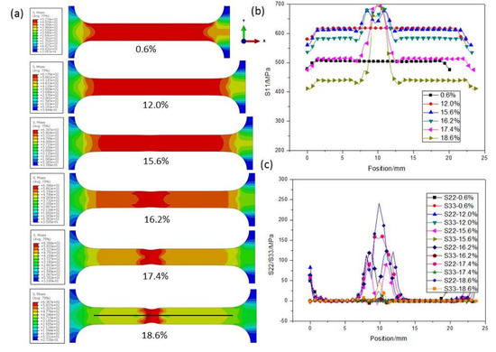 Figure 7a and Figure 8a present the Mises equivalent stress q distribution maps of CG and UFG Ti under different tensile strains, respectively. Distributions of stresses in the tension direction (S11) and the directions of width (S22) and thickness (S33) along the black line of the CG and UFG Ti are shown in Figure 7b,c and Figure 8b,c. It can be seen that in the initial stage of drawing, the specimen is in a uniaxial stress state, and there is only stress along the tensile axis, while necking introduces three-dimensional stress state. It should be noted that the axial stress (S11) outside the necking region goes down after stress concentration starts, indicating an unloading effect, which agrees with the test results (Figure 4).